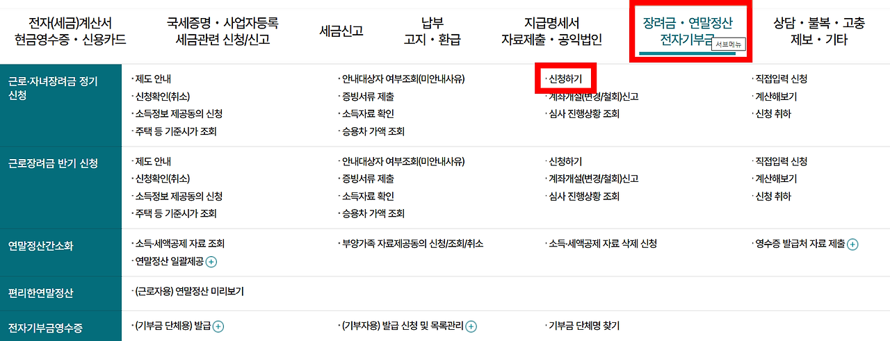 안내문을 받지 못했다면 국세청 홈택스 홈페이지에 접속해 장려금·연말정산 전자기부금 > 신청하기 메뉴에서 신청하셔야해요. 아래 그림을 참고해주세요!